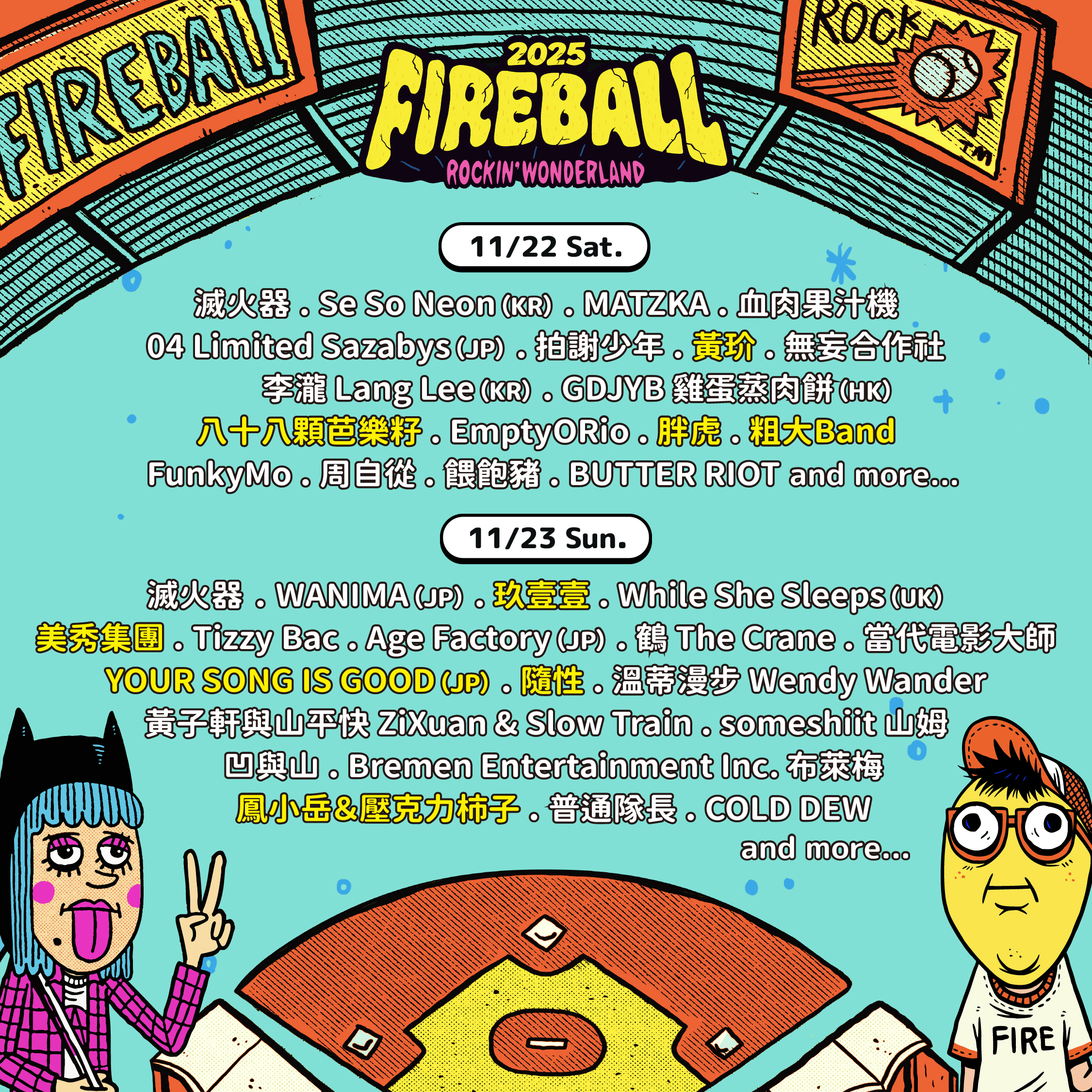 一年一度在樂天桃園棒球場舉辦的「FIREBALL Fest. 火球祭」將於今年11月22日及11月23日登場。陸續釋出超強陣容震懾樂圈的火球祭,在 10/1 中午釋出最新一波分日陣容,由玖壹壹以及美秀集團兩組「台客神團」領軍,搭配多組如黃玠、鳳小岳、隨性、八十八顆芭樂籽、胖虎......等「各有台味」的特色陣容,讓網友笑稱「天啊這波台客大軍我喜歡,我收!」